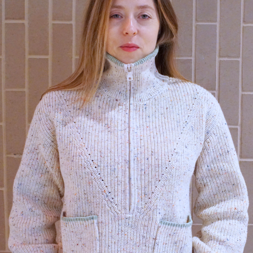 Staying true to our brand mission, Jhula's first-ever half-zip sweater is designed to move with you through every season of motherhood and beyond. Crafted in a soft cotton-blend shaker rib with playful sprinkle-like flecks, it keeps you cozy without overheating from fall through spring.